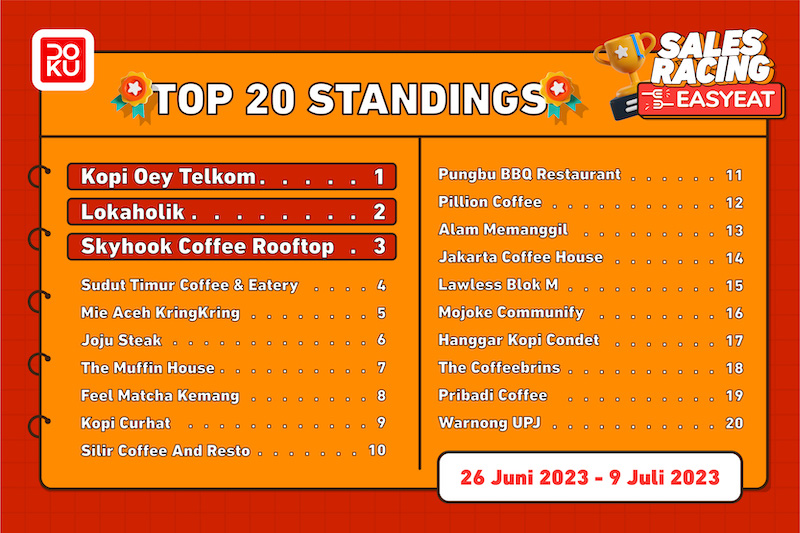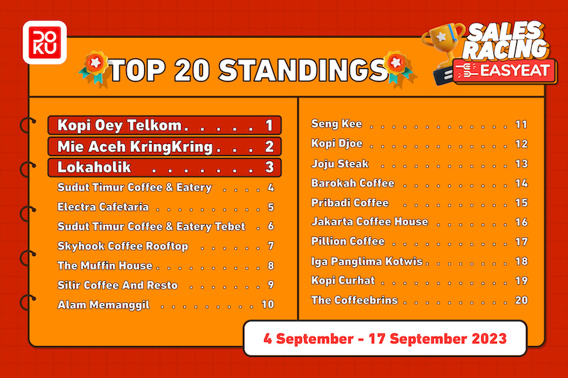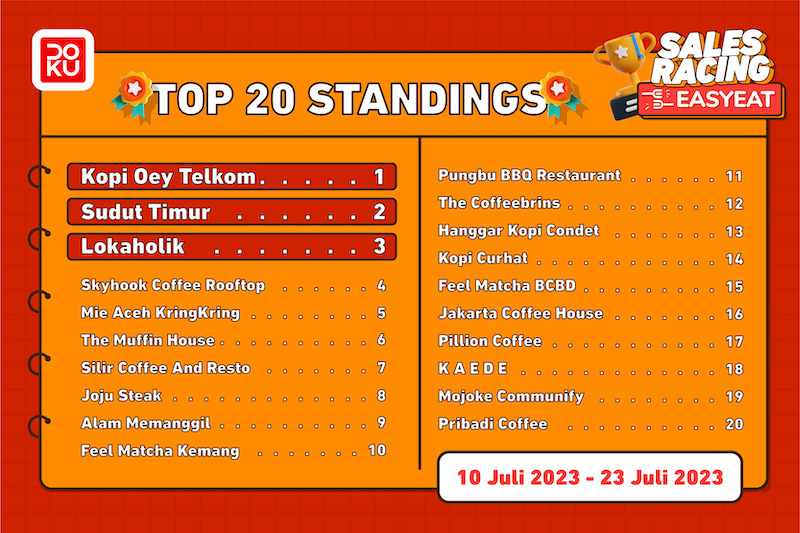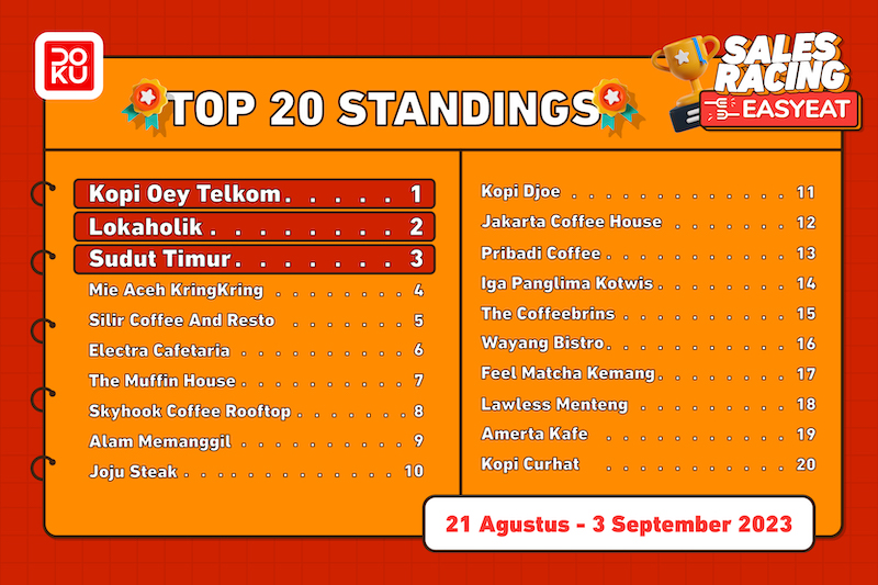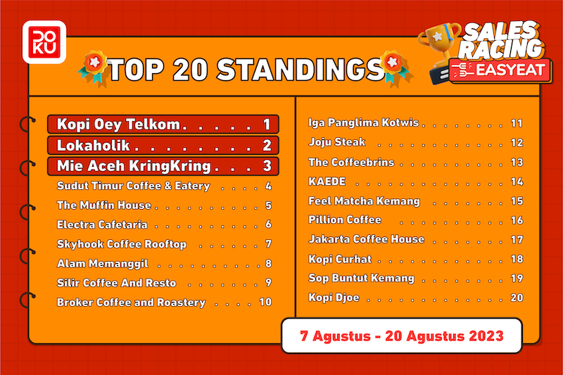 20 gerai dengan penjualan terbaik akan mendapatkan hadiah dengan total nilai sebesar 17.5 juta rupiah! Ayo cek list merchant EasyEat dengan posisi 20 merchant dengan penjualan terbaik periode Agustus 2023!